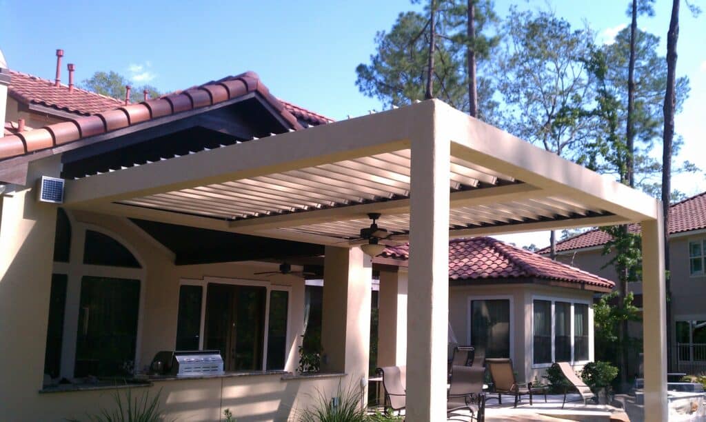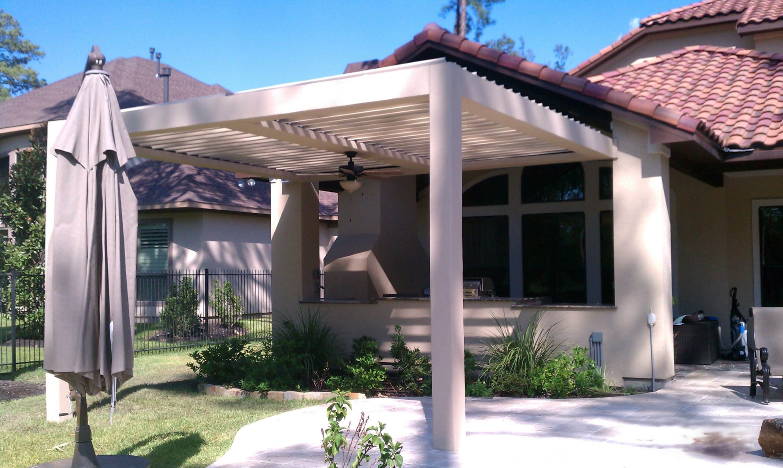 Custom stucco wrapped columns to the existing residence. Adjustable aluminum louvers with the touch of a button, the roof opens to let in beautiful morning light or closes tightly to block the harsh afternoon sun and rain. Beautiful outdoor living space.